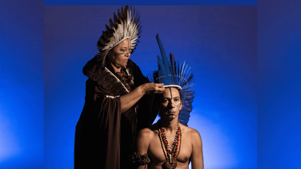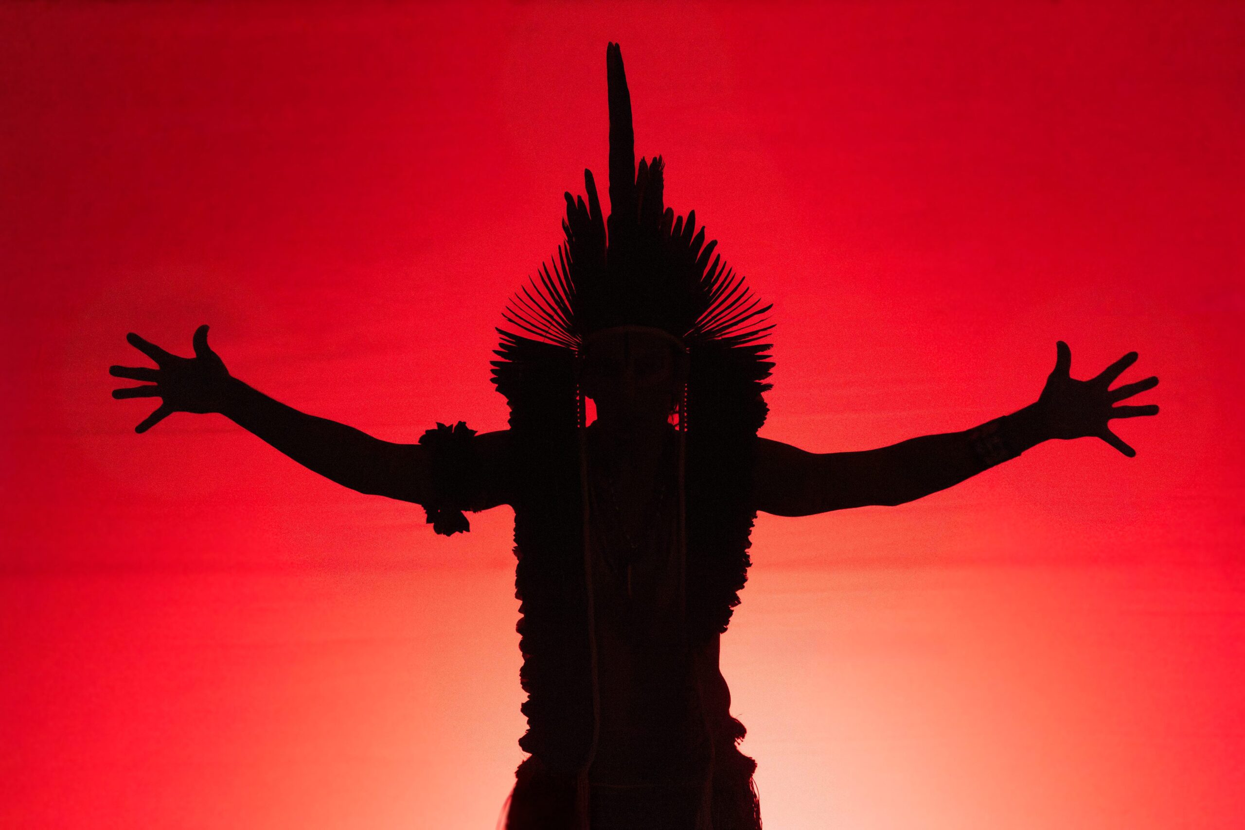 Os adereços das comunidades indígenas foram trabalhados para reconectar vestimentas sagradas ao espetáculo contemporâneo por meio de escolhas rigorosas, com muito cuidado. “Tudo é sagrado, territórios, rituais, vestimentas de pajés, xamãs, das filhas dos pajés. O figurino foi feito com respeito à ancestralidade, realizado de maneira não folclórica, longe dos estereótipos”, explica a figurinista.