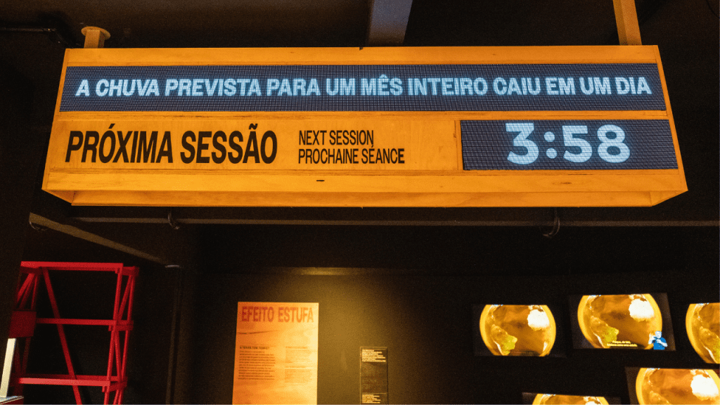 Esse despertar já aparece em filmes, séries, reportagens e outras manifestações culturais. A própria exposição, com roteiro de Claudio Angelo e Fernando Meirelles, é um exemplo desse movimento. Nos painéis, globos, gráficos, simuladores e no “Vocabulário do Clima”, o visitante acessa conceitos essenciais como efeito estufa, combustíveis fósseis, pontos de não retorno e energias renováveis.