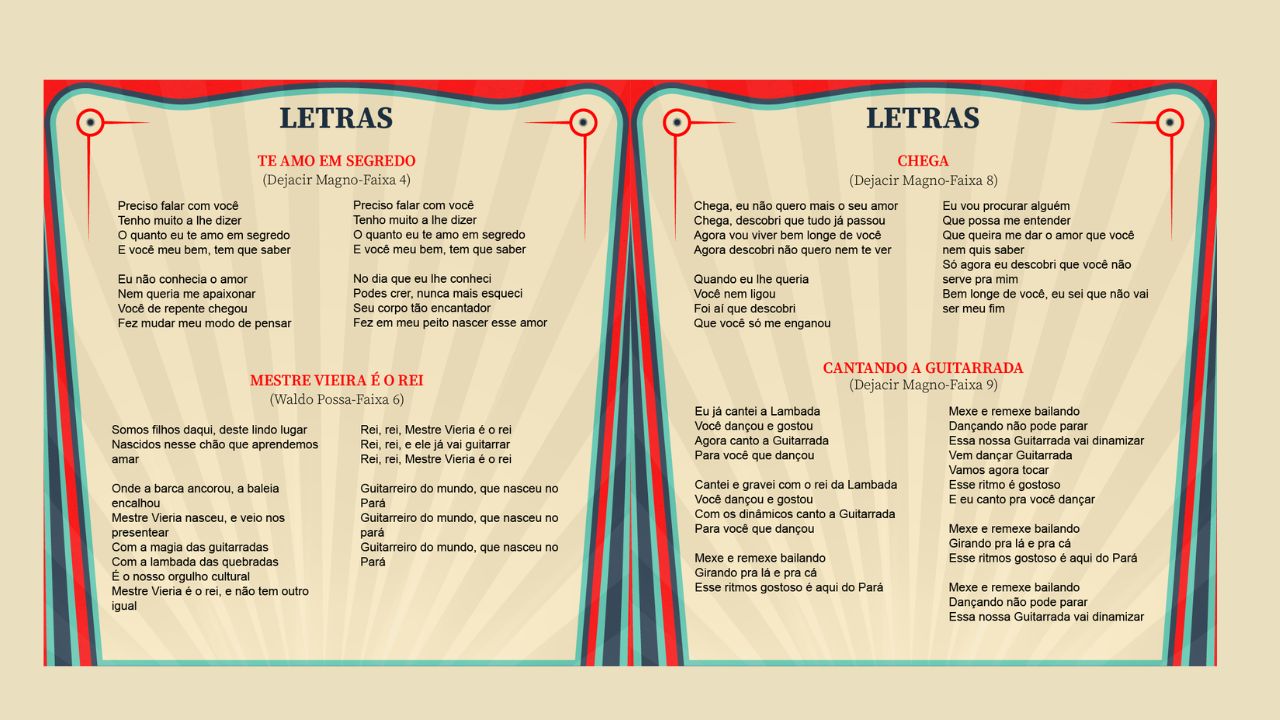O repertório é um passeio pela sonoridade amazônica: merengue, cúmbia, brega e carimbó se entrelaçam na batida da guitarrada. O resultado é um álbum que honra a tradição, mas não se prende ao passado. Os arranjos, assinados em sua maioria por Cassiano Neto, com participação de Dejacir Magno, Luís Poça e Wesley Souza, dão frescor às composições.