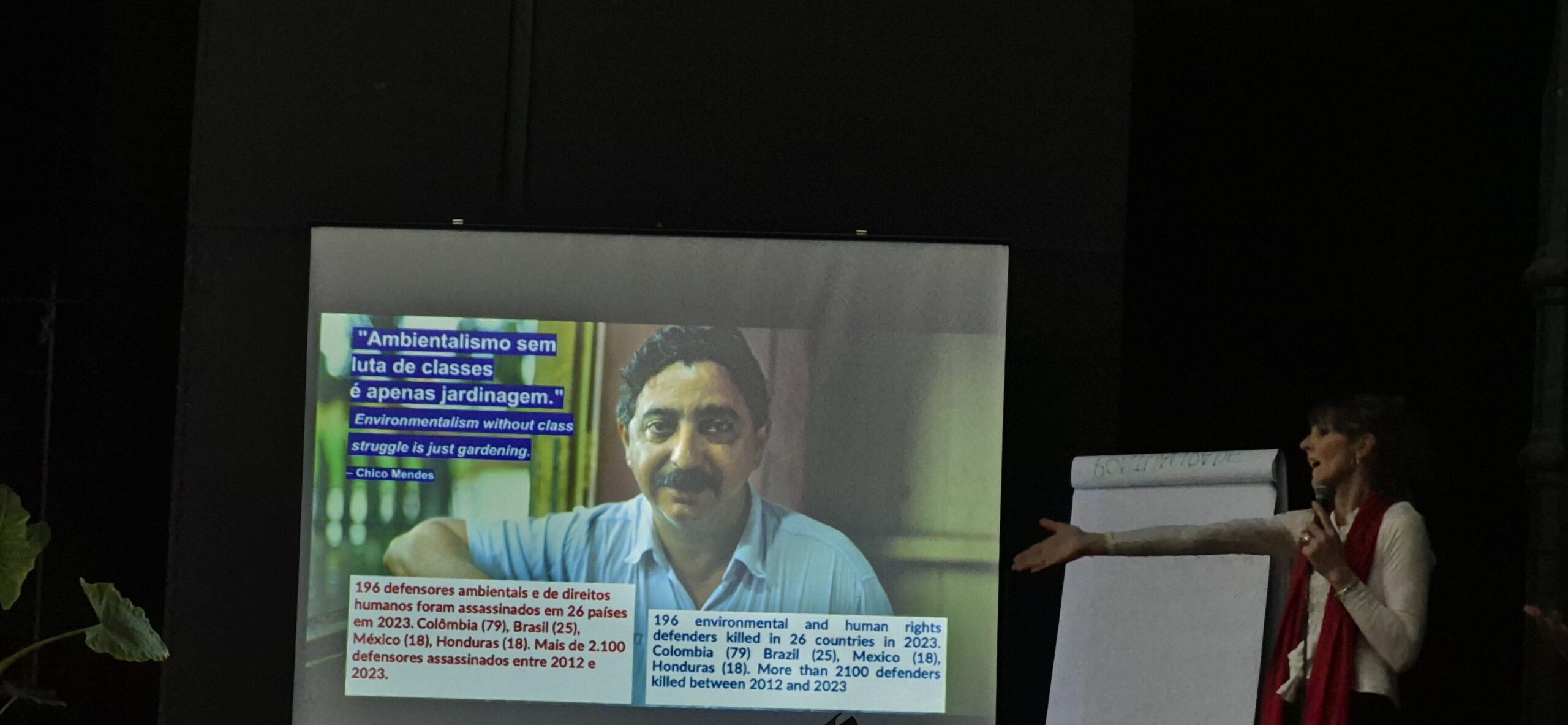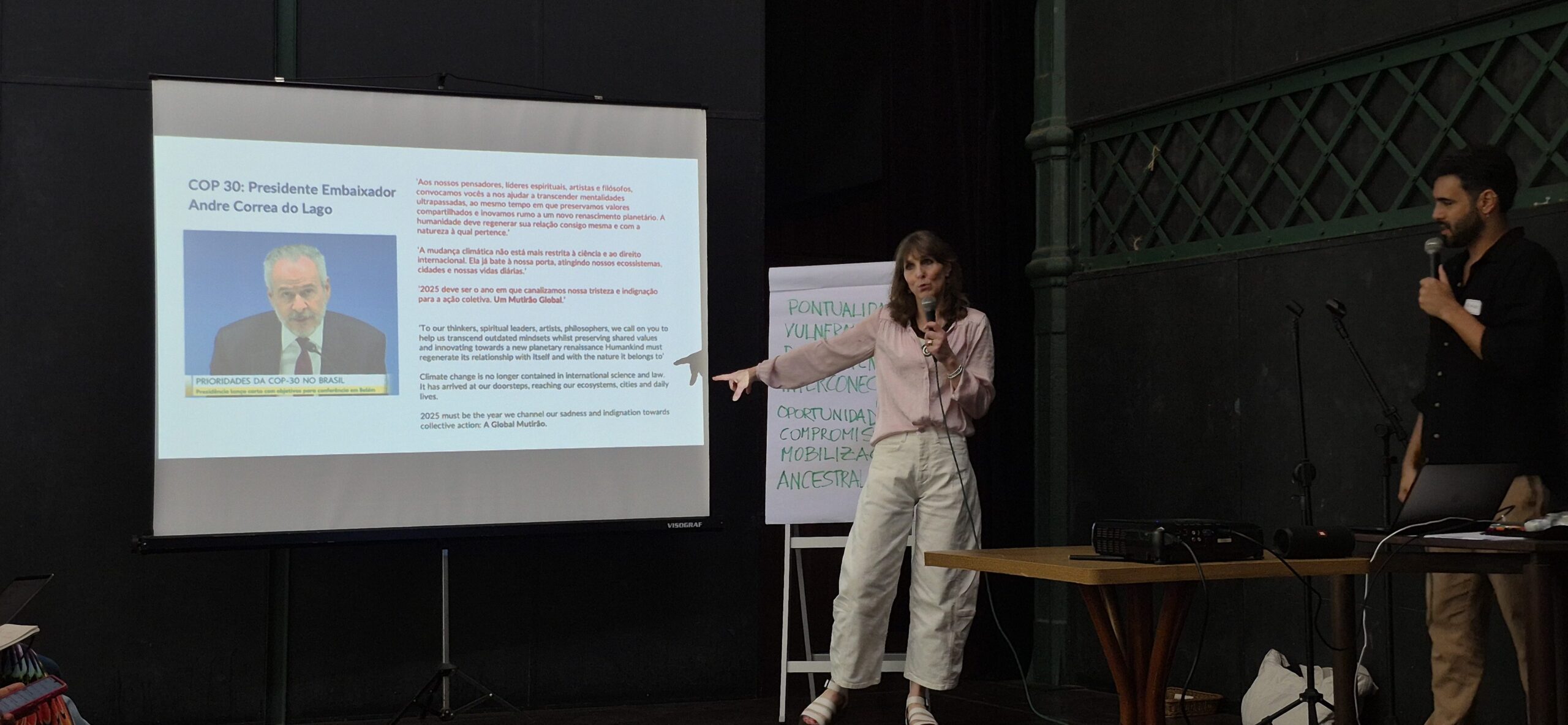 Além de Alison Tickell (Julie’s Bicycle) e Thiago Jesus (People’s Palace Projects), também foi uma facilitadora, a Isadora Canela (Collective Webs), de Brumadinho (MG). Eles compartilharam experiências, ferramentas e estratégias sobre cultura e ação climática no Brasil e no mundo.